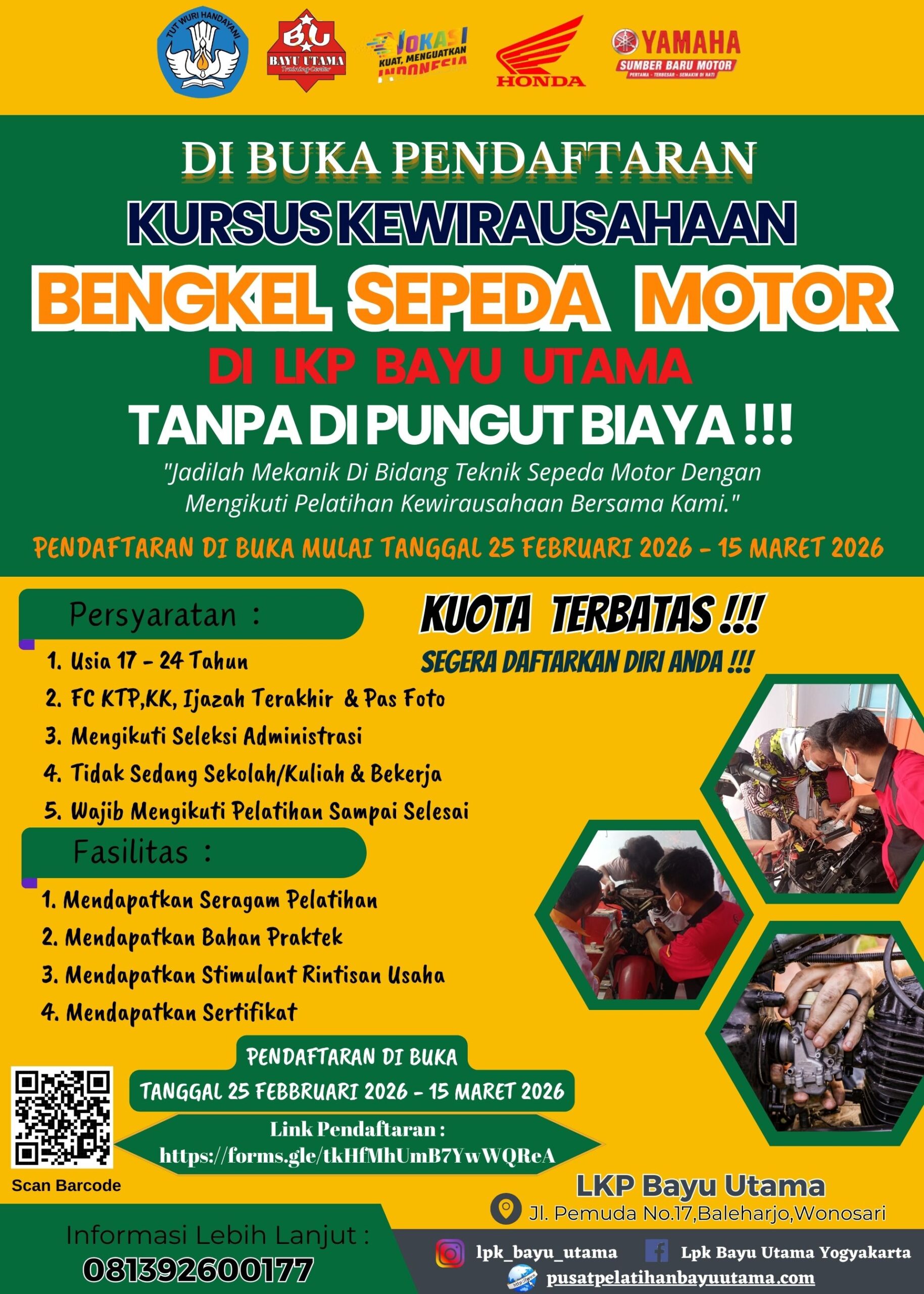 LKP Bayu Utama membuka kesempatan bagi masyarakat yang ingin punya usaha sendiri melalui Program Pelatihan Bengkel Sepeda Motor!